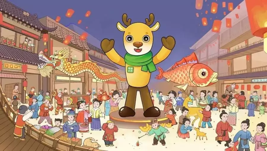 整体看起来强壮、有力、治愈、呵护,呈现出一个健康又温暖的“健康鹿”形象吉祥物的名字——呦呦,取自《诗经·小雅·鹿鸣》的开篇,“呦呦鹿鸣,食野之苹”,其字面意思是:一群鹿儿在原野上悠然自得地啃食艾蒿,发出的鸣声。