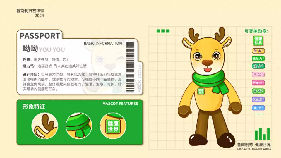 吉祥物的原型——马鹿,谐音“鲁”,将其拟人化,增添柳叶条、健康世界勋章等鲁南制药元素,打造出独属于鲁南制药的“健康鹿”形象柳叶条幻化成寓意温暖呵护的围巾;健康世界的九江吉祥物设计公司勋章,可根据不同产品替换,更加符合公司需要。